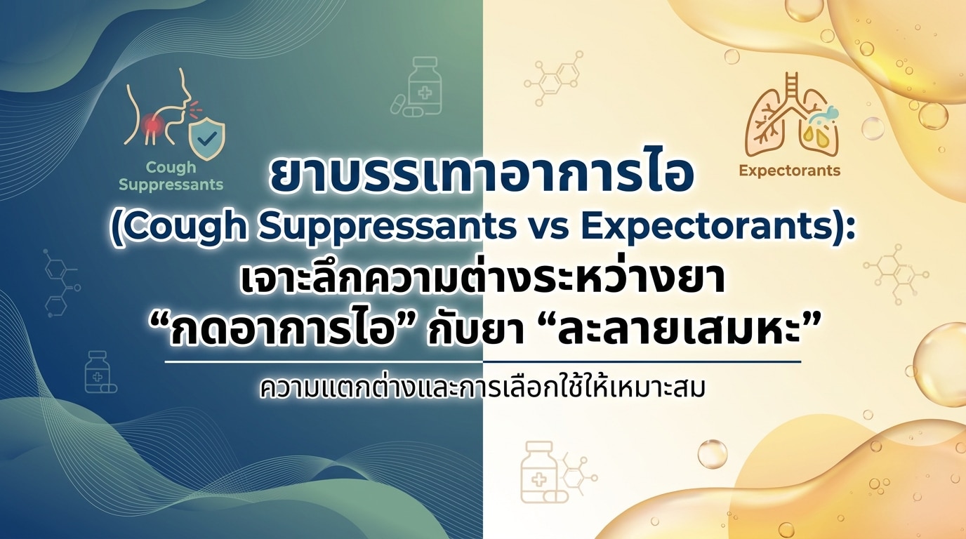 อาการไอเป็นปฏิกิริยาปกติของร่างกายที่ช่วยขับสิ่งแปลกปลอมออกจากทางเดินหายใจ แต่เมื่ออาการไอกลายเป็นความน่ารำคาญหรือส่งผลกระทบต่อชีวิตประจำวัน การเลือกใช้ ยาบรรเทาอาการไอ ที่เหมาะสมจึงเป็นสิ่งสำคัญ ปัญหาคือ หลายคนอาจยังสับสนระหว่าง ยากดอาการไอ (Cough Suppressants) กับ ยาละลายเสมหะ (Expectorants) ซึ่งมีกลไกการทำงานและวัตถุประสงค์ในการรักษาที่แตกต่างกันอย่างสิ้นเชิง การทำความเข้าใจความต่างนี้จะช่วยให้คุณเลือกยาได้อย่างถูกต้องและปลอดภัย เพื่อบรรเทาอาการได้อย่างตรงจุด