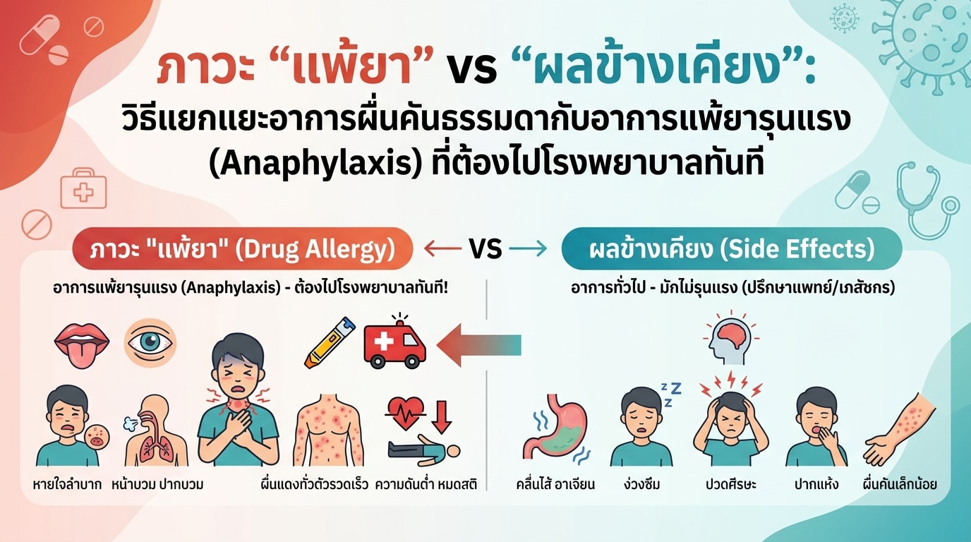 ภาวะ “แพ้ยา” vs “ผลข้างเคียง”: วิธีแยกแยะอาการผื่นคันธรรมดากับอาการแพ้ยารุนแรง (Anaphylaxis) ที่ต้องไปโรงพยาบาลทันที