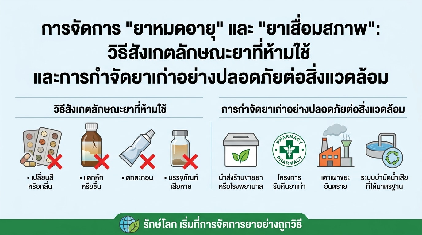 ในบ้านของทุกท่าน คงมีตู้ยาหรือกล่องยาที่เก็บรักษามานาน และบางครั้งเราอาจเผลอเก็บยาบางชนิดไว้จนลืม ทำให้ไม่แน่ใจว่ายาเหล่านั้นยังสามารถใช้ได้หรือไม่ การใช้ ยาหมดอายุ หรือ ยาเสื่อมสภาพ ไม่เพียงแต่จะทำให้การรักษาไม่ได้ผล แต่ยังอาจก่อให้เกิดอันตรายต่อสุขภาพอย่างร้ายแรงอีกด้วย นอกจากนี้ การทิ้งยาเก่าอย่างไม่ถูกต้องยังส่งผลเสียต่อสิ่งแวดล้อมในระยะยาว ในฐานะผู้เชี่ยวชาญด้านสุขภาพ เราจะมาแนะนำวิธีการสังเกต ยาที่ห้ามใช้ และขั้นตอนการ กำจัดยาเก่าอย่างปลอดภัย เพื่อสุขภาพที่ดีของคุณและสิ่งแวดล้อมที่ยั่งยืน