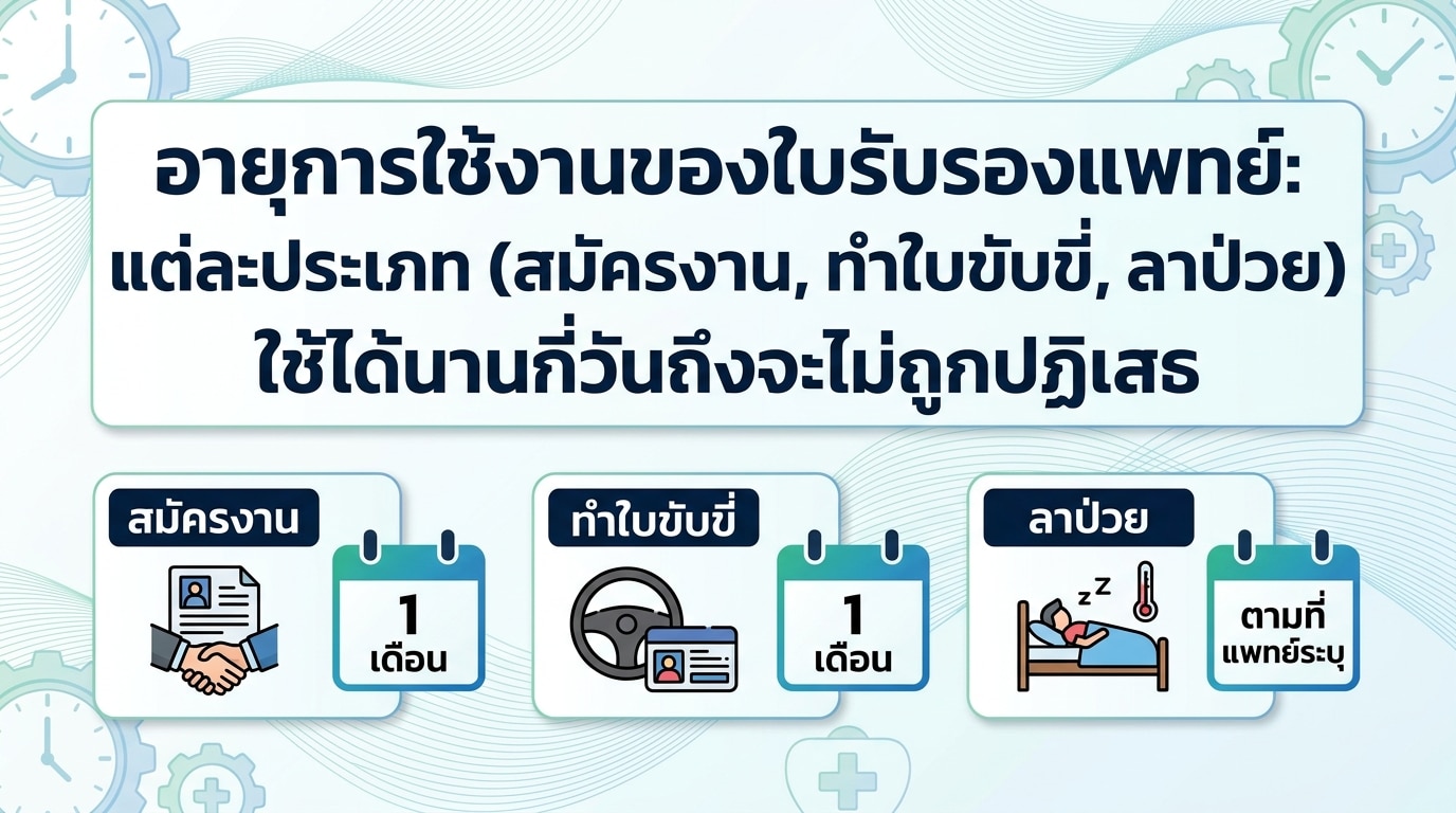 Meta Description: ค้นหาอายุการใช้งานของใบรับรองแพทย์แต่ละประเภท! ไม่ว่าจะเป็นสมัครงาน, ทำใบขับขี่, หรือลาป่วย ใบรับรองแพทย์ของคุณใช้ได้นานแค่ไหนถึงจะไม่ถูกปฏิเสธ อ่านเลย!