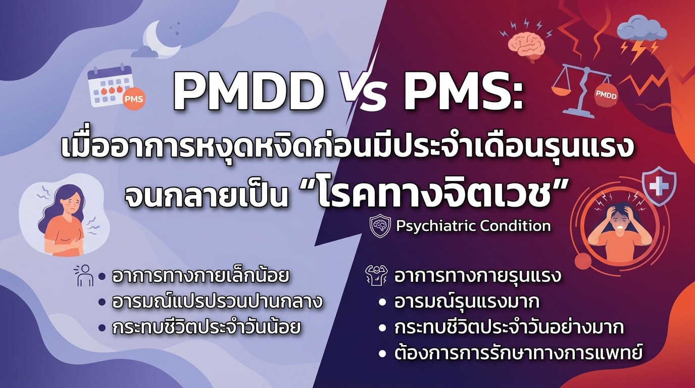 ผู้หญิงหลายคนคุ้นเคยกับอาการหงุดหงิด อ่อนเพลีย หรือแม้กระทั่งความรู้สึกเศร้าหมองที่มักจะมาเยือนในช่วงก่อนมีประจำเดือน หรือที่เรียกว่า อาการก่อนมีประจำเดือน (PMS) แต่จะเกิดอะไรขึ้นเมื่ออาการเหล่านี้รุนแรงขึ้นจนกระทบต่อชีวิตประจำวัน ความสัมพันธ์ และสภาพจิตใจอย่างรุนแรง? นั่นอาจไม่ใช่แค่ PMS ธรรมดา แต่อาจเป็นสัญญาณของ Premenstrual Dysphoric Disorder (PMDD) ซึ่งจัดเป็น “โรคทางจิตเวช” ชนิดหนึ่งที่ร้ายแรงกว่ามาก ในบทความนี้ เราจะมาเจาะลึกถึง ความแตกต่างระหว่าง PMDD และ PMS เพื่อให้คุณเข้าใจอาการที่เกิดขึ้นกับร่างกายตัวเองมากขึ้น และรู้ว่าเมื่อไหร่ที่คุณควรปรึกษาแพทย์ผู้เชี่ยวชาญ