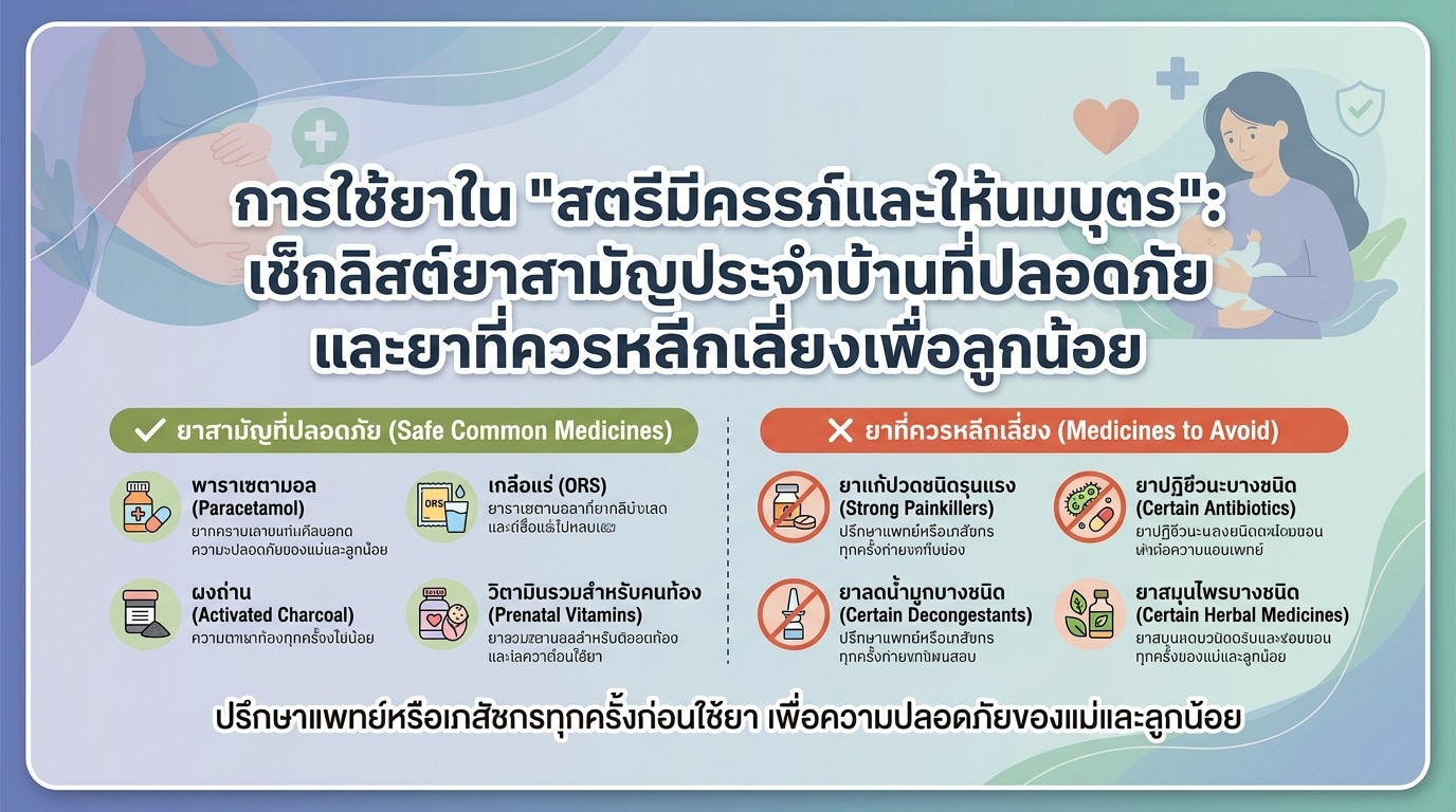 การเป็นคุณแม่คือการเปลี่ยนแปลงที่ยิ่งใหญ่ในชีวิต และหนึ่งในความกังวลลำดับต้นๆ คือเรื่อง ความปลอดภัยของลูกน้อย ไม่ว่าจะเป็นช่วงเวลาที่ลูกอยู่ในครรภ์ หรือช่วงเวลาที่คุณแม่ให้นมบุตร การเจ็บป่วยเล็กๆ น้อยๆ เช่น เป็นไข้ ปวดหัว หรือแพ้อากาศ ก็อาจทำให้คุณแม่ต้องคิดหนักว่า “จะกินยาอะไรได้บ้าง?” เพราะยาส่วนใหญ่ที่เราคุ้นเคย อาจส่งผลกระทบต่อพัฒนาการของลูกได้ บทความนี้จะพาคุณแม่ไปรู้จักกับ ยาสามัญประจำบ้านที่ปลอดภัยสำหรับสตรีมีครรภ์และให้นมบุตร พร้อมทั้งชี้ให้เห็นถึง ยาที่ควรหลีกเลี่ยงอย่างเด็ดขาด เพื่อให้คุณแม่มั่นใจและดูแลสุขภาพของตัวเองและลูกน้อยได้อย่างถูกวิธี