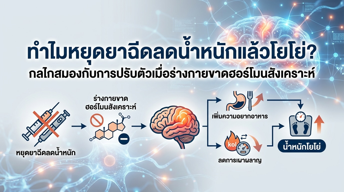 ภาวะโยโย่เอฟเฟกต์ หลังจากหยุด ยาฉีดลดน้ำหนัก ไม่ใช่เรื่องแปลกใหม่ แต่เป็นกลไกการปรับตัวที่ซับซ้อนของร่างกายและสมอง ที่ตอบสนองต่อการขาด ฮอร์โมนสังเคราะห์ การทำความเข้าใจ กลไกสมอง ในการควบคุมความหิว-อิ่ม และการเปลี่ยนแปลงของระบบเผาผลาญ จะช่วยให้เราเตรียมรับมือและวางแผนป้องกันได้ดีขึ้น การลดน้ำหนักที่ยั่งยืนนั้นไม่ได้มาจากการพึ่งพายาเพียงอย่างเดียว แต่ต้องอาศัยการผสมผสานระหว่างการดูแลทางการแพทย์ การปรับเปลี่ยนพฤติกรรมการกิน การออกกำลังกาย และการดูแลสุขภาพองค์รวม หากคุณกำลังพิจารณาหยุดยาฉีดลดน้ำหนัก หรือกำลังเผชิญกับภาวะโยโย่เอฟเฟกต์ อย่าลังเลที่จะปรึกษาแพทย์และนักโภชนาการเพื่อขอคำแนะนำที่เหมาะสมและสร้างแนวทางที่ยั่งยืนสำหรับสุขภาพที่ดีของคุณ