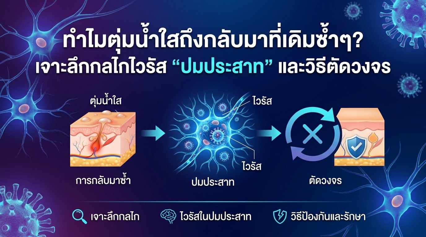 คุณเคยสงสัยไหมว่าทำไม ตุ่มน้ำใส ที่สร้างความเจ็บปวดและไม่สบายตัวมักจะกลับมาปรากฏซ้ำๆ ที่ตำแหน่งเดิมอยู่เสมอ? หลายคนอาจคิดว่าเป็นเพียงแผลทั่วไปที่เกิดจากปัจจัยภายนอก แต่แท้จริงแล้ว เบื้องหลังของการกลับมาซ้ำซากนี้ มีกลไกทางวิทยาศาสตร์ที่ซับซ้อนของ ไวรัส ชนิดหนึ่งที่ซ่อนตัวอยู่ใน “ปมประสาท” ของเรา! การทำความเข้าใจกลไกนี้คือกุญแจสำคัญในการ ตัดวงจร การเกิดซ้ำ และช่วยให้คุณสามารถจัดการกับปัญหานี้ได้อย่างมีประสิทธิภาพมากยิ่งขึ้น