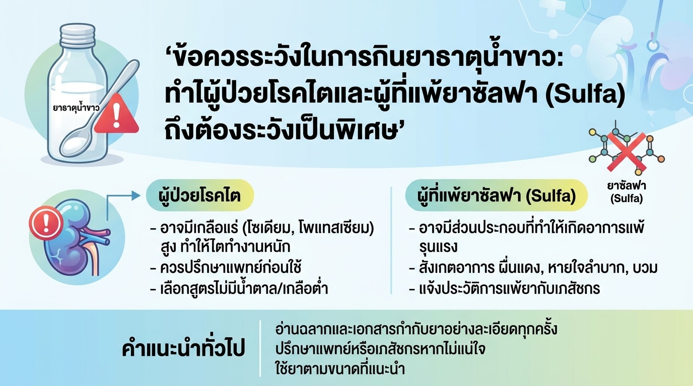 ยาธาตุน้ำขาว เป็นยาที่คนไทยคุ้นเคยและนิยมใช้เพื่อบรรเทาอาการไม่สบายท้อง เช่น ท้องเสีย ท้องอืด ท้องเฟ้อ หรือปวดท้องจากอาหารไม่ย่อย ด้วยสรรพคุณที่ช่วยเคลือบกระเพาะอาหารและลดอาการอักเสบ จึงเป็นยาสามัญประจำบ้านที่หลายคนมีติดไว้ อย่างไรก็ตาม แม้จะเป็นยาที่หาซื้อง่าย แต่การใช้ยาธาตุน้ำขาวก็มีข้อควรระวัง โดยเฉพาะอย่างยิ่งในกลุ่มผู้ป่วยบางประเภท เช่น ผู้ป่วยโรคไต และผู้ที่แพ้ยาซัลฟา (Sulfa) การละเลยข้อมูลเหล่านี้อาจนำไปสู่ผลข้างเคียงที่รุนแรงได้ บทความนี้จะเจาะลึกถึงเหตุผลว่าทำไมคนกลุ่มนี้จึงต้องระมัดระวังเป็นพิเศษ และสิ่งที่ควรทราบก่อนตัดสินใจใช้ยา