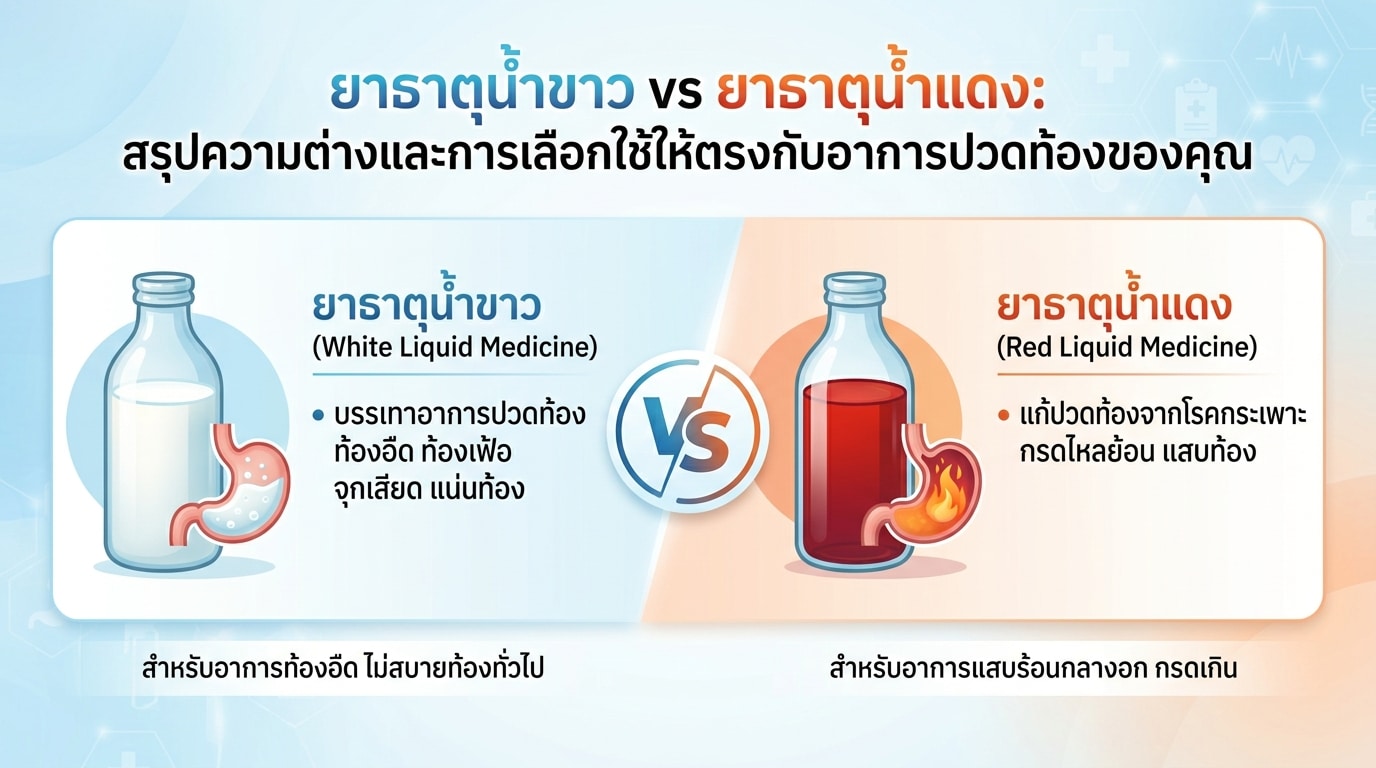 ยาธาตุน้ำขาว vs ยาธาตุน้ำแดง: สรุปความต่างและการเลือกใช้ให้ตรงกับอาการปวดท้องของคุณ